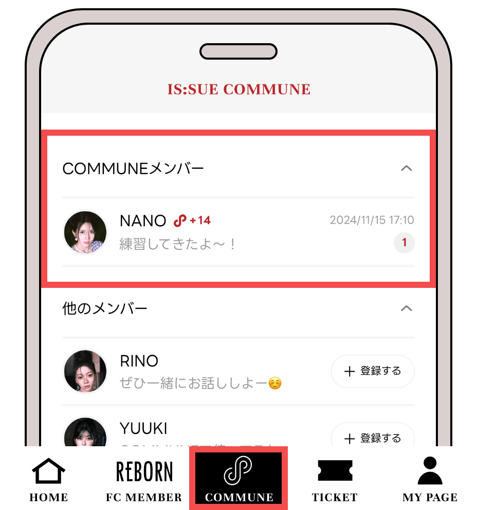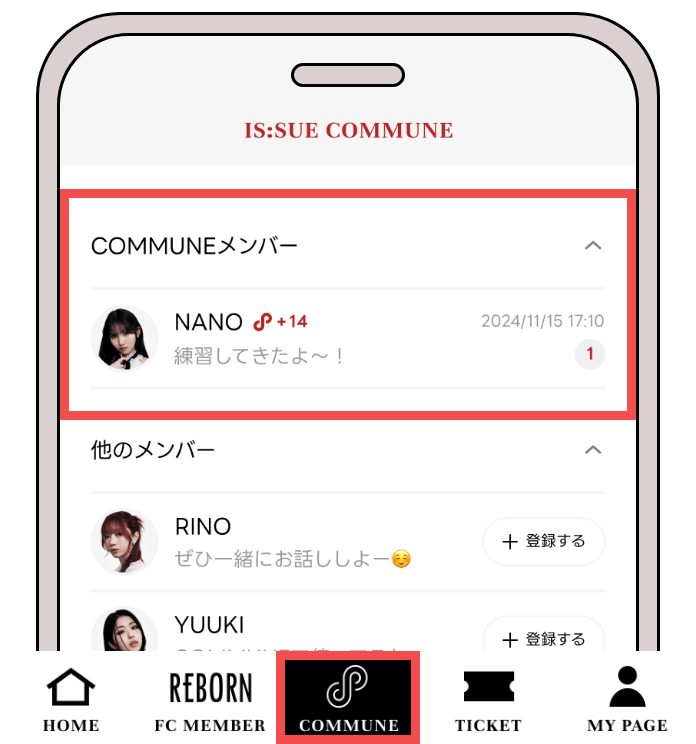 決済が完了すると、登録したメンバーがCOMMUNEメンバーとしてIS:SUE 公式アプリで表示されます。